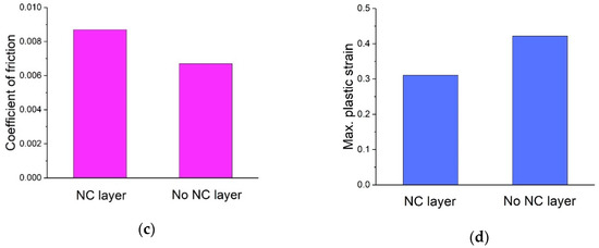 Results for presence of NC layer: (a) frictional force; (b) normal force; (c) coefficient of friction; (d) max. equivalent plastic strain.