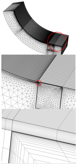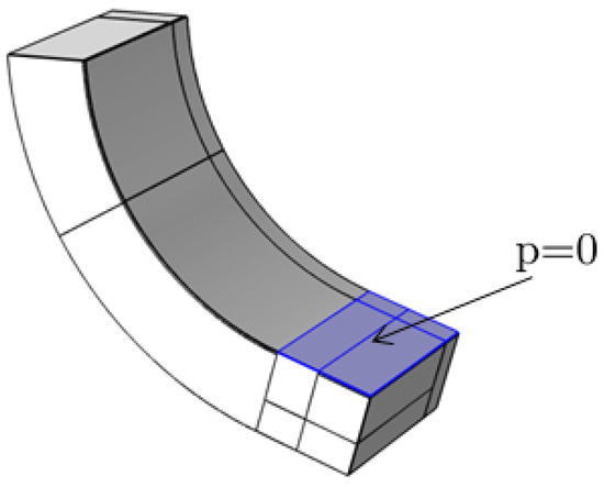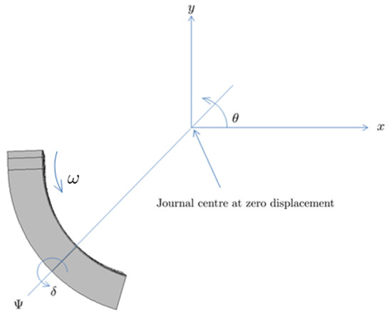 where are the radial pad- and bearing clearances, respectively, d is the pad thickness, is the journal radius and are the journal x and y eccentricities, respectively. Moreover, is the angular position of the pivot (see Figure 4). This film thickness is imposed in COMSOL by adding a mesh displacement equal to in the normal direction to the pad surface on the top surface of the fluid domain (fluid–shaft interface). The parameter is arbitrary but should be of the same order as h. It represents the (constant) film thickness of the original geometry. To find the tilt angle , an equation for the moment balance around the pivot is added to the set of governing equations, it has the form