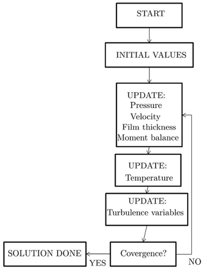 The babbit coating was meshed with brick elements and the remaining, bulk part, of the pad was meshed with tetrahedal elements. Only linear shape functions were used. Since the turbulence variables k and proved very sensitive to the wall resolution in the groove, a total of 20 layers were used with an initial thickness of 1 m and a stretching factor of . Using this mesh, the maximum values was always such that , which is typically considered as a well resolved boundary layer. More specifically, the mesh on the bulk part of the pad was made up by 101,509 tetrahedals and 3255 pyramids; the babbit coating mesh consisted of 6510 hexahedral elements; the mesh in the LEG consisted of 34,973 tetrahedals, 1107 pyramids, 38,352 prisms and 13,100 hexahedrals; finally, the deforming part of the fluid domian consisted of 45,360 hexahedrals with 12 elements, most of them close to the walls as illustrated in Figure 6, across the film thickness, 160 elements along the circumferential direction with a higher density closer to the inlet and, finally, 18 elements across (half) the axial length. To assess the grid independence of the simulations, this mesh was refined by using twice the amount of elements in the axial and circumferential direction and 16 elements across the film thickness. The mesh in the LEG was also refined, by cutting the maximum element size in half. This refinement was only done for the fluid domain with the exception of the upper LEG domain, adjacent to the journal, where the number of elements in the circumferential direction could not be increased without causing the meshing algorithm to crash. It was, however, deemed that this part of the mesh was already fine enough. With this refined mesh, the relative differences between maximum temperature- and pressure were and , respectively, or, in absolute terms, K and MPa. Due to the rapid increase in computational burden with the finer mesh, the original mesh was deemed as an acceptable trade-off between accuracy and numerical efficiency. Moreover, the relative tolerance level was put to 0.01. The reason for this relatively high value was that the convergence rate was very slow while still the solution monitoring probes exhibited a more or less steady state behavior well before a relative solution error of 0.01 was passed. This indicates that it is probable that the solution was converged in an averaged sense. Moreover, a schematic scheme of the iteration process is outlined in Figure 7. In each update block, the variables are solved for simultaneously using a damped Newton algorithm.