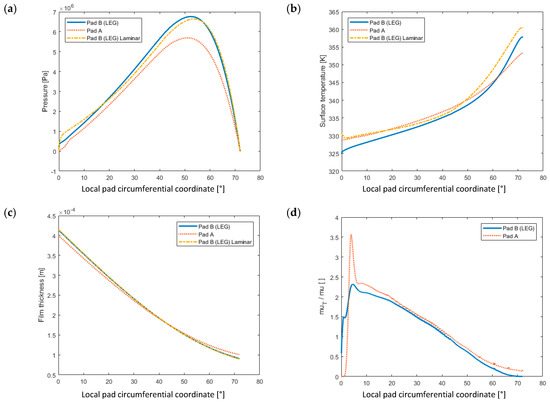 Comparison of results between Pad A and B, including laminar results: (a) pressure; (b) surface temperature; (c) film thickness; (d) ratio of turbulent through molecular viscosity. All plots are versus the local pad circumferential coordinate at the symmetry plane.