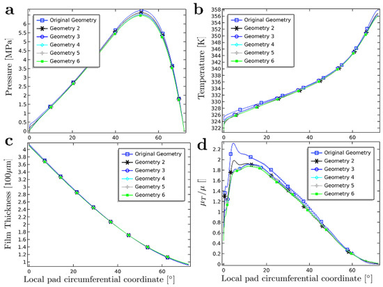 Comparison of results between the different geometry cases (Cases 1–6) where the lengths of the LEG geometry ( and ) are stepwise diminished: (a) mid plane pressure; (b) mid plane surface temperature; (c) film thickness; (d) ratio of turbulent through molecular viscosity. All plots are versus the local pad circumferential coordinate.