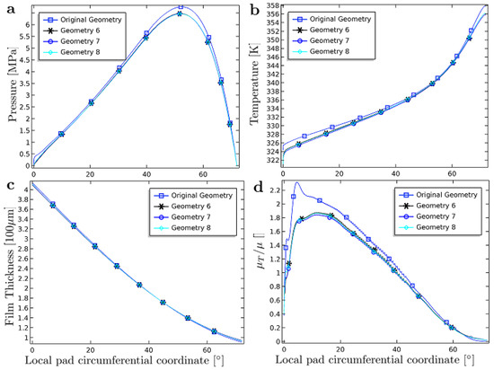 From Figure 10a, it is observed that the mid plane pressure profile remains almost the same as the groove depth is diminished. The same observation is made concerning the mid plane surface temperature profile in Figure 10b, the film thickness profile in Figure 10c and the turbulent to molecular viscosity ratio in Figure 10d. However, a somewhat peculiar result is spotted in Figure 10d where the level of turbulence first reduces, relative to Geometry 6, when the groove depth is set to only to increase again when the depth is further reduced to ; the difference is, however, as previously mentioned, very small.