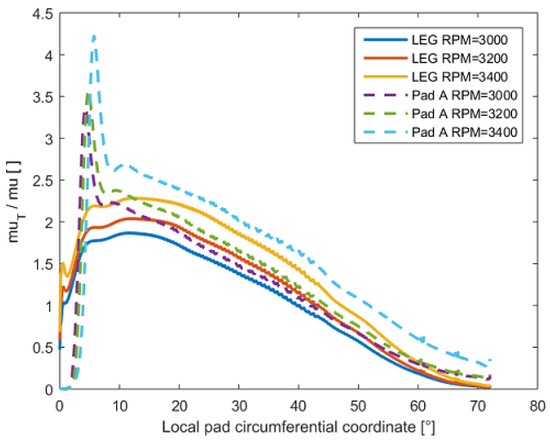 From Figure 11, observing the ratio of turbulent to molecular viscosity as a function of rotational speed, it seems as the Pad A model inherently generates more turbulence compared to the Pad B (LEG) model. This is in direct contrast to the notion of He et al. [7] that the LEG portion causes an increase of turbulence.