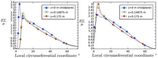 So far, only the turbulence levels in the mid plane(symmetry plane) have been studied. As it turns out, when the same ratio, i.e., , is plotted at axial positions m and m (i.e., at the axial end), an interesting feature, which is illustrated in Figure 12, reveals itself. The geometry used for the LEG in Pad B corresponds to its original geometry.
