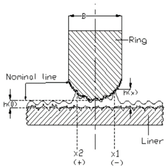Figure 1 illustrates the surface of contact between the PR and the cylinder liner. Over the distance: Δx = x2 − x1 the PCC can be assumed to experience mixed friction, due to the combination of pure hydrodynamic lubrication points (where sufficient amount of lubricant exists to separate the two surfaces in contact) and pure boundary friction points (where there is an insufficient amount of lubricant between the two surfaces in contact) [7].