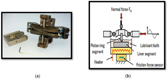 Original engine parts for the experiment were used, as shown in Figure 3, to replicate the PCC interaction during normal engine operation. All tests are run using a SRV®III by Optimol Instruments Prueftechnik GmbH, Westendstraße 125, 80339 München, Germany. The SRV consists of a fixed bottom specimen support and a mobile replaceable top specimen holder. The holder is responsible for clamping the different ring and liner geometries as shown in Figure 4a and is dipped in an oil bath as shown above in Figure 4b.