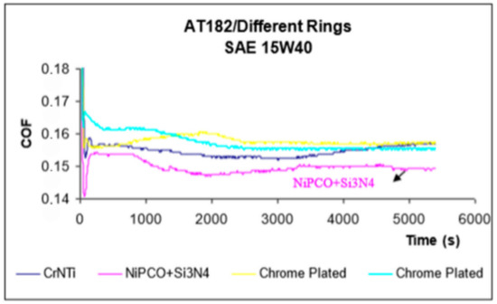 However, the PR coating of CrN-TiN 1º Group still lost the least amount of mass. This can be attributed to the fact that CrN (Chromium nitrate) and TiN (Titanium Nitrate) are known for their good wear resistance [18]. More specifically, CrN and TiN are applied in racing car engines, where the PCC experiences greater piston speeds [19] due to the car travelling at high speeds during a race. For example, a Formula 1 engine V10-type experiences 37–48 m/s, whilst a regular European 2.0-L engine type Inline 4 has a maximum piston speed of up to 32 m/s [15]. The greater piston speeds that a piston experiences in race cars indicate of the greater frictional force. Given that CrN and TiN are used for race car applications, it can be expected for them to exhibit good wear resistance, especially at a low speed of 0.3 m/s, as used during this experiment.