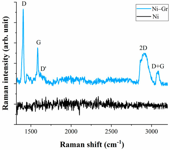 The Raman spectra for Ni and Ni–Gr coatings at 532 nm laser excited at 5 mW for the range of 100–3500 cm−1 is shown in Figure 1. In the Raman spectra of Ni coating, there were no significant peaks observed, whereas for the Ni–Gr coating five peaks were observed at 1404 cm−1 (D-mode), 1583 cm−1 (G-mode), 1620 cm−1 (D’), 2775 cm−1 (2D-mode), and 3085 cm−1 (D+G-mode) [44,45,46]. This confirms the inclusion of Gr in the electrodeposited Ni–Gr composite coating.