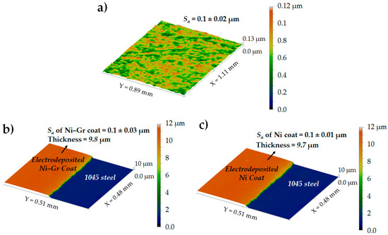 The Ni and Ni–Gr coating thickness as obtained were ~9.8 and ~9.7 μm, respectively. It can also be seen that the Sa of all the samples before and after the coating was within the range of 0.1 ± 0.05 μm. Hence, the comparison of these coatings for their tribo-metallurgical behavior was rational. The surface roughness and profile data indicated an excellent finish of electrodeposit coatings with a surface roughness that corresponded to the substrate surface.