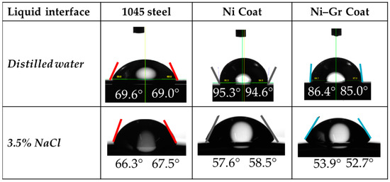 The contact angle of the steel, nickel, and nickel–graphene coated surfaces were measured using both liquids. The contact angle of distilled water and 3.5% NaCl measured on 1045 steel surface, Ni coating, and Ni–Gr coating is shown in Figure 3.