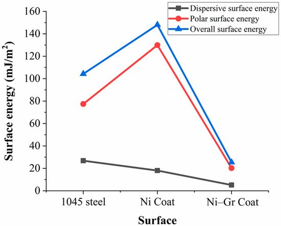 The measured contact angle, as well as the calculated surface energy values of 1045 steel, Ni coating, Ni–Gr coating, are given in Table 3. These measurements were used in the Fowkes’ surface energy calculations to obtain two linear equations (one equation for each liquid) correlating the dispersive () and polar () components of surface energy for the given solid surface. The variation in calculated surface energy values with its components for each surface are shown in Figure 4.