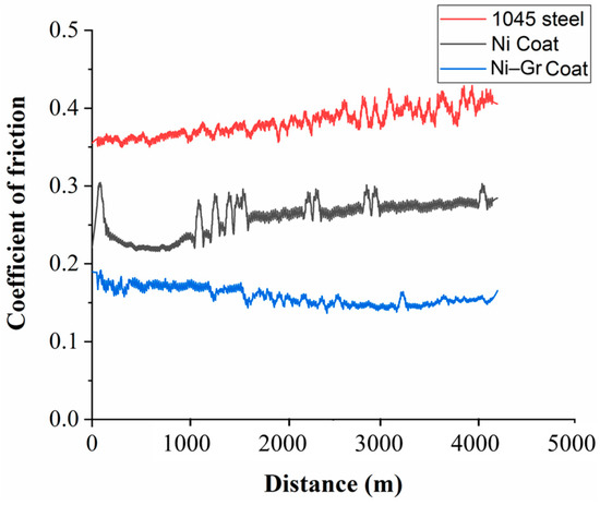Reciprocating sliding tests were performed to understand the friction and wear behavior of coating in correlation with the surface energy. The coefficient of friction and wear data were recorded by sliding SiN ceramic ball over the 1045 steel, Ni coated, and Ni–Gr coated surfaces. A normal load of 2 N on the ceramic ball of 3 mm diameter was applied over a sliding distance of 4200 m. The maximum Hertzian contact pressure under the static condition at the interface of the tribo-pair, SiN and 1045 steel, was calculated to be 1432.5 MPa with an expected maximum penetration depth of 0.012 mm [56]. The evolution of the coefficient of friction (COF) during sliding is shown in Figure 5. An average COF of 0.42 ± 0.06, 0.372 ± 0.09, and 0.194 ± 0.04 was observed for 1045 steel, Ni coating, and Ni–Gr coating, respectively. It can be observed that as sliding progressed, the COF increased for 1045 steel (18% increase over a distance of 4200 mm) and the Ni coated surface (12% increase over a distance of 4200 mm), while it decreased by 11% for the Ni–Gr coating.