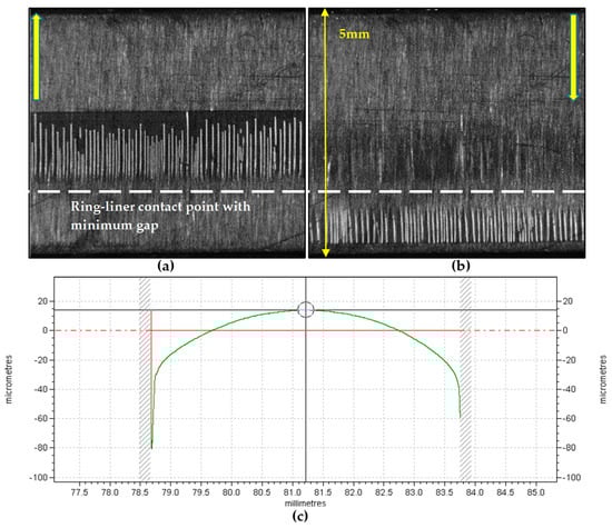 - The shorter length of the cavities in down-stroke, around 35% for all lubricants, compare to those in the up-stroke motion is related to the ring profile which is not symmetrical with a contact point at an offset from the centerline towards the lower edge of the ring with much smaller diverging area during the down-stroke motion.