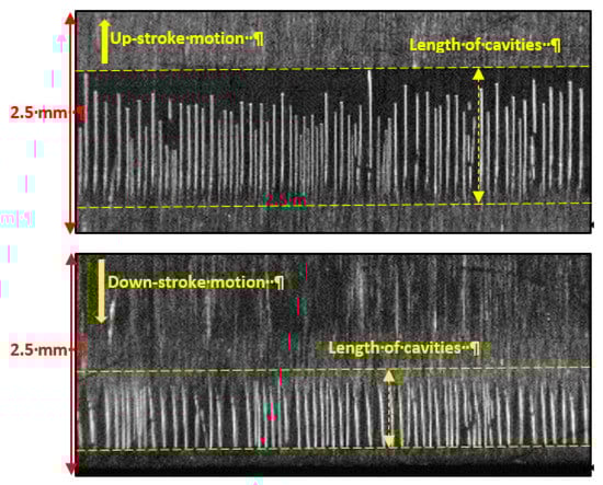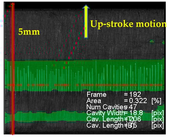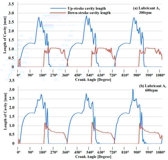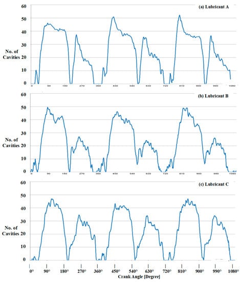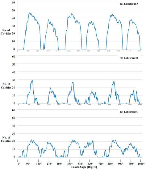 - In up-stroke motion, at fully developed state, the length of cavities measurements from images were 1.36 mm, 1.2 mm and 0.95 mm for Lubricant A, B and C, respectively, giving a reduction of about 12% and 30% for Lubricants B and C when compared to Lubricant A. the corresponding values for down-stroke were 0.91 mm, 0.74 mm and 0.59 mm giving a reduction of 18.7% and 35% for Lubricants B and C when compared to Lubricant A. This is expected as lowering the lubricant viscosity results in a reduction of negative pressure and therefore less cavities.