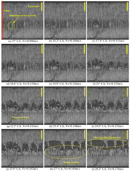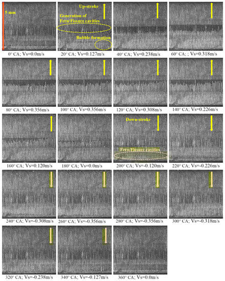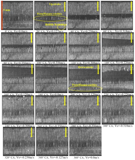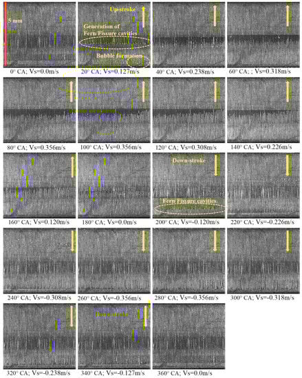 - The visualisation images, during the up-stroke motion, showed that a small fern cavity is initiated at a nucleation site at around 15° CA, which grows and spread quickly with time during which other ferns start to appear. As they grow, they start to coalesce and form the fissure type cavities, which are unstable and spread rapidly in all direction and after joining the neighbouring fissures they form a stable sheet cavitation at their forefront while at their tails they breakup into stable strings type cavitation. Similar patterns have been observed during down-stroke motion.