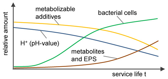 Simultaneous to a decreasing number of additives over time due to the metabolic activity of microorganisms, compounds of microbial origin are released continuously in the metalworking fluid, such as low-molecular metabolites, surface-active agents, or extracellular polymeric substances (EPSs). The changes taking place in the cooling lubricant are shown schematically in Figure 1. Other consequences of bacterial colonization are decreasing pH values, increasing droplet sizes [8], or mechanical problems in the metalworking fluid cycle due to clogging of filters, pumps, and so on, by biofilms [7]. Further changes in the metalworking fluid occur due to thermal decomposition of molecules and oxidation processes, which take place in non-water miscible fluids, too. The metalworking fluid is therefore continuously subject to a combination of chemical, physical and biological effects. Consequently, the metalworking fluid is subjected to modifications resulting from the aging process, which are partly irreversible [8].