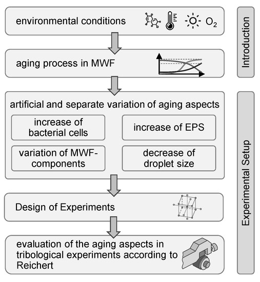 In this paper, an experimental program was developed and conducted that enabled a comprehensive analysis of the influence of aging processes on the lubricity of metalworking fluids. For this purpose, the design of experiments method was used. Besides the evaluation of interactions between the aspects, this approach also enabled the creation of an empirical regression model. The methodical approach of the presented work is schematically depicted in Figure 2.