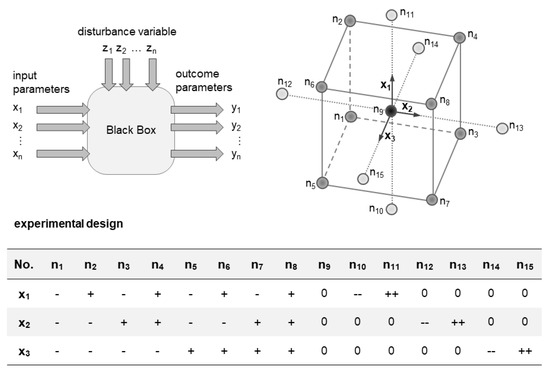Top left: a black box view of an experiment according to [15]. Top right: graphical illustration of a central composite design (CCD) according to [16]. Bottom: the variation of the input parameters x1, x2, and x3 listed in tabular form.