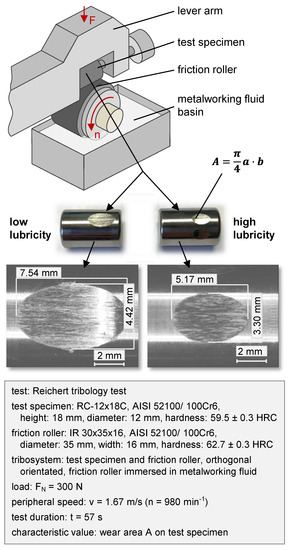 For evaluating the lubricating abilities of the analyzed metalworking fluid samples, the tribology test according to Reichert has been engaged, since this test is very appropriate for the measurement of low-viscosity fluids such as water-miscible lubricants. The employed tribological system of the Reichert test consists of a cylindrical test specimen and a friction roller (both standard components of rolling bearings), which are crossed at an angle of 90° (Figure 4). The test specimens are pressed against the friction roller at a constant load of F = 300 N, while the friction roller is immersed in the investigated fluid. In the experiment, the friction roller rotates for a duration of 57 s with a peripheral speed of 1.67 m/s, supplying a continuous contact zone with the test fluid. The size of the resulting worn area on the test specimen is the central benchmark of the Reichert tribology test, and it is used as a benchmark for the lubricating ability of the examined fluid. The lower the worn area, the higher the lubricating ability. The term “lubrication” is used here as a general term for the property of reducing friction and wear. This includes the separation of the friction partners by a lubricating film, which is particularly relevant in the range of low tribological loads, as well as the avoidance of wear through the effect of EP/AW additives by adsorption of molecules on the metal surface, which is of importance in the range of higher tribological loads.
