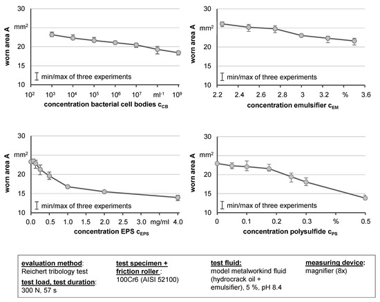 The selected aspects, the boundaries of the examined parameter variations, and the effect of a higher concentration on the worn area A are summarized in Figure 5 according to [14]. The appearance of cell bodies is a consequence of the aging processes in water-miscible metalworking fluids. With the accumulation of cell bodies, the lubricity of the fluid also increases. There is no loss of quality with an increasing amount of cell bodies. Therefore, future monitoring and maintenance strategies for metal working fluid should focus on the fluid composition and a homogenous concentration rather than on the prevention of bacterial colonization. Because of the deterioration of emulsifying components in the metalworking fluid by microorganisms, the droplet size increases. In the experiments, the emulsifier concentration varied between 2.25% and 3.5%. A decreasing emulsifier concentration leads to a decline in the lubrication ability, as the results showed. The smaller the droplet size, the better the droplets can reach the contact zone between the friction partners [14].