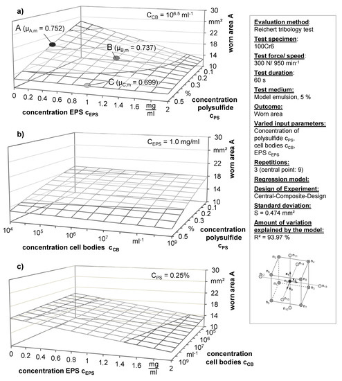 The interaction term in the model takes two input parameters, polysulfide and EPS concentrations, into account and represents a saturation effect of the two components in combination. Both polysulfide and EPS had a strong influence on the lubricity. If they were combined, the resulting lubricity increased further but could not be described by the sum of the two individual influencing variables. This characteristic is described approximately by the interaction coefficient. This correlation is an interesting and a fundamentally new finding, which could be achieved through the use of design of experiment methods. This saturation effect can be attributed to the decreasing amount of available space on the metal surface. Both the surface-active biopolymers of EPS and the polysulfide reduce wear by adsorbing molecules on the metal surface. With increasing concentration, a further increase of the concentration as well as the combination with another “additive” becomes less and less effective as the molecules cannot find a place on the metal surface anymore.