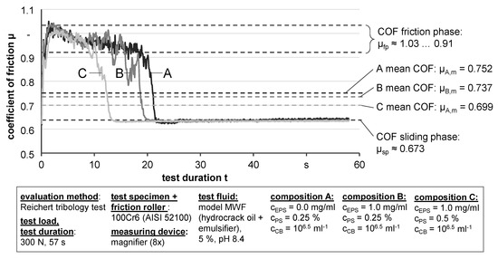 Beside the resulting wear, the coefficient of friction is also a property of tribological systems with fundamental relevance. Therefore, in addition to the evaluation of the wear surface, the development of the coefficient of friction in the course of a test was evaluated on three exemplary samples (Figure 7). For a better comparability with the wear surface, the three examined metalworking fluid samples (A, B, and C) are also marked in Figure 6.