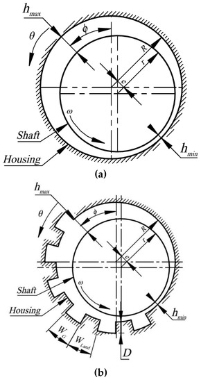 Schematic representation of (a) smooth (untextured) journal bearing geometry and (b) textured journal bearing geometry.