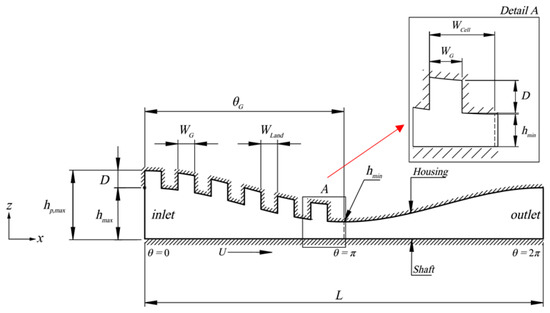 In the present work, the flow behavior induced by the surface motion is solved by calculating the Navier–Stokes instead of Reynolds theory for incompressible flow. As discussed by Li and Chen [28] and Dobrica and Fillon [29], due to the large texture depth as studied here, high-pressure gradients in the surface’s normal direction may be exhibited, and thus, the prediction of Reynolds theory leads to incorrect results of the pressure distribution. In order to obtain more accurate results, in this study, the Reynolds-averaged Navier–Stokes (RANS) equation coupled with the mass conservation equation are used.