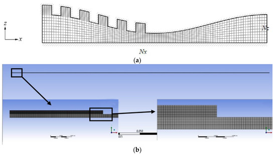 To determine the appropriate mesh density for evaluating the lubricant characteristics of the journal bearing accurately, the meshing analysis needs to be performed. In the present study, for the calculation the CFD-based commercial software ANSYS DesignModeler and ANSYS ICEM CFD were employed to produce the computational model and structural mesh, respectively. The computational domain is meshed with the uniform quadrilateral grid, as shown in Figure 3. The number of mesh points in the longitudinal (Nx) and transverse (Nz) direction was varied in order to get mesh independence. In addition, more refinement of the mesh system, particularly around the dimple area, was also conducted to capture the presence of the flow recirculation due to the sudden change in texture geometry. Consequently, the mesh number used was around 200,000 to 400,000 nodes across the film depending on the texturing zone, dimple depth, and eccentricity ratio.