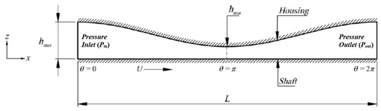 In the present work, as reflected in Figure 4 the boundary condition of the computational domain was set as follows: One side of the location of the maximum film thickness, hmax, is used as an inlet condition and the other as an outlet. The pressure at the inlet (Pin) and outlet (Pout) boundaries is taken as the ambient pressure, i.e., zero pressure. The top wall of the lubricant film is modelled as a stationary surface, whereas the bottom surface is modelled as a moving surface assuming no-slip condition and a rotational velocity equal to that of the shaft. During the calculation in ANSYS FLUENT® software, the regions of cavitation and the hydrodynamic pressure are computed with the MIXTURE model.
