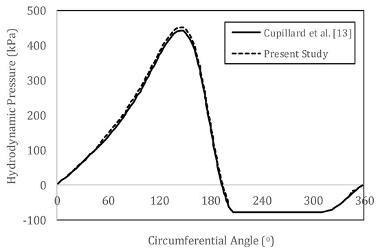 Comparison between hydrodynamic pressures of journal bearings obtained by the present work and by Cupillard et al. [13].