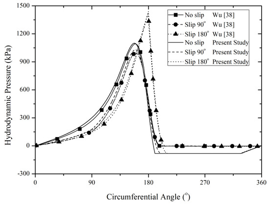 The comparison of hydrodynamic pressure profile between the simulation results by the present study and that by Wu [38]. All results were evaluated at at ε = 0.8.