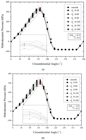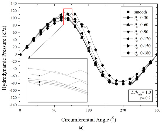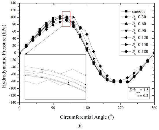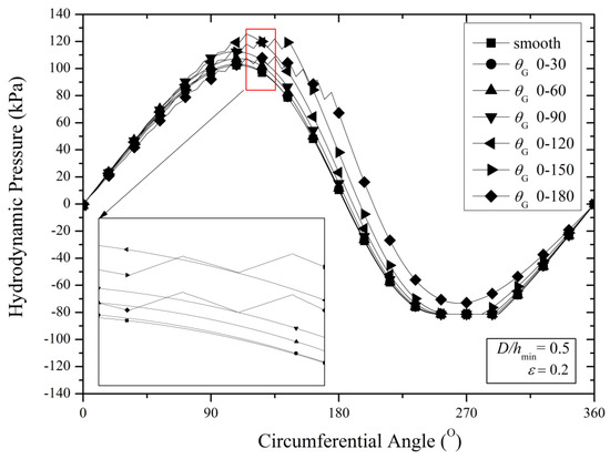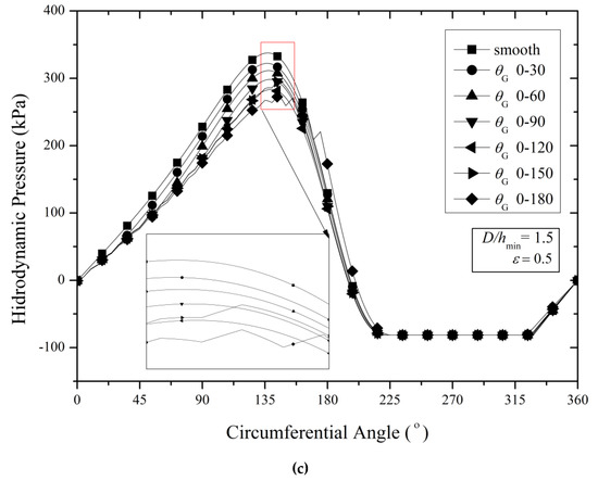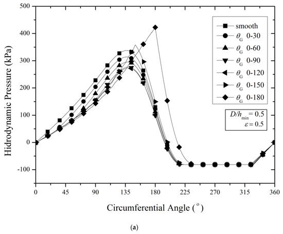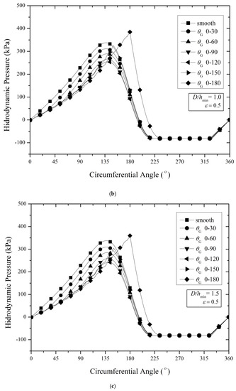 Based on Figure 7, it is also highlighted that even though the bearing pattern with a high texturing zone ( = 0–180°) generates a higher-pressure gradient at the ending edge of the texturing zone compared to the smooth pattern, such an increase in the pressure gradient does not provide enough enhancement of the pressure profile. Evidently, a similar trend can also be observed for other texture depths. For example, when the dimensionless texture depth, D/hmin, is increased by a factor of 2, no significant change in the pressure profile is found. Only a little reduction in the peak pressure is observed when the texture depth is increased. Further, by comparing the results shown in Figure 7a–c, it can be revealed that with respect to the prediction of the peak pressure, the effect of the surface texturing becomes severe with the increase in texture depth and texturing zone. In other words, for the case of ε = 0.5, setting the textured pattern with the highest texture depth and texturing zone considered here gives the worst tribological performance.