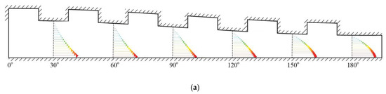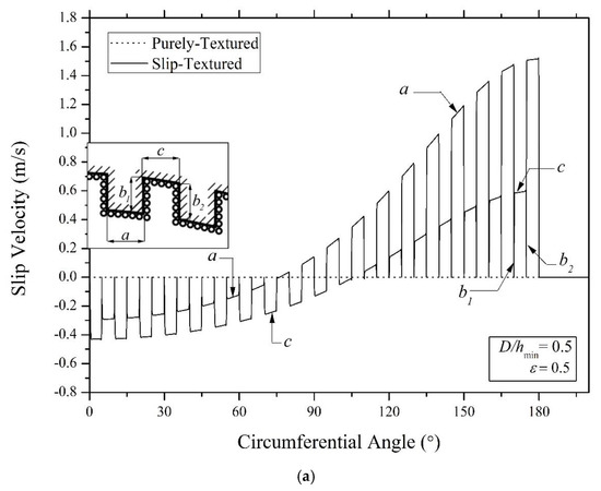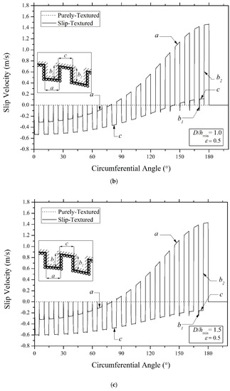 Secondly, at the end of the texturing zone, i.e., at the circumferential angle of around 160 to 180°, the slip velocities both on the edge of the texture valley (denoted by c) and the edge of the texture peak (denoted by a) tend to reduce with the increase in the texture depth. For the case of D/hmin = 1.5, the slip velocities on the interface of the texture valley edge have a negative textured zone. It indicates that there is backflow inside texture cells. This behavior is different with the case of the bearing with lower texture depth, say D/hmin = 0.5 in this case; at the edge of the texture valley along the textured surface, as can be observed in Figure 9a, the sign of the slip velocity changes from negative to positive. Based on the physical point of view, at the beginning, the condition of backflow marked by “negative” slip velocity will slow down the lubricant, especially at the textured zone of 0–120°. Then, the lubricant at the interface of the texture valley edge moves at the higher flow rate due to the presence of the specific value of slip velocity in the range of 0.2 to 0.6 m/s.