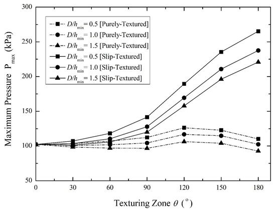 In the numerical experiment, the parameters employed are shown in Table 1. These parameters are unchanged until otherwise determined. In order to study the effect of the texture parameter (i.e., texture depth in this section) on the hydrodynamic performance of the lubricated contact either in the case of the purely textured bearing or the case of the slip-textured bearing, the calculations were performed. It will be highlighted that particular care should be conducted in determining the texturing parameters, i.e., the texture depth and the texturing zone of the contact because an inappropriate choice can lead to a decrease in the hydrodynamic pressure. In the present study, computations were performed by comparing the performance of the textured (with/or without slip) bearing over the classical (smooth and no-sip) bearing for three different conditions of D/hmin by varying the length of the texturing zone in terms of the pressure profile. An eccentricity ratio, ε, of 0.5 is employed in this section.