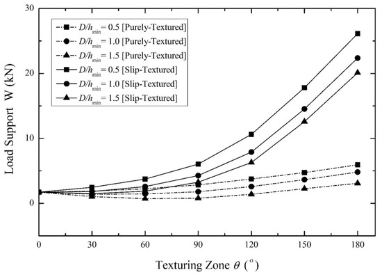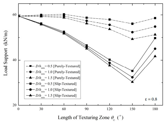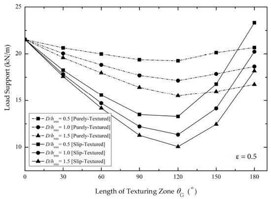 With respect to the performance of the load support, the effect of the length of the texturing area by varying the texture depths is shown in Figure 11. The simulation results show that increasing the length of the texturing zone, θG, will improve the load support irrespective of the textured depth. It can clearly be seen that a significant improvement can be achieved when the extension of the texturing zone is combined with the application of the slip boundary. For example, in the case of D/hmin = 0.5, in comparison to the smooth (untextured) case, a 900% improvement in load support is obtained when the texturing zone is applied to cover the convergent area (i.e., θG = 180°). For the same pattern (D/hmin = 0.5, θG = 0–180°) without slip, the load support predicted is about 5 kN (or just 150% larger compared to the smooth bearing). It can also be said that when slip is employed on the texturing bearing with θG = 0–180°, for example, the load support can be enhanced by from 450% to 550% depending on the D/hmin value.