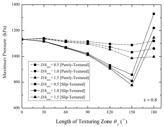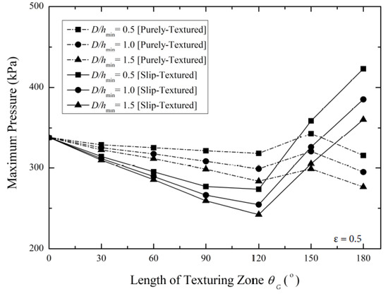 Figure 10 gives the maximum pressure, Pmax, as a function of the length of the texturing zone, θG, for the case of ε = 0.2 (light loaded bearing). As shown in Figure 10, in the case of the slip-textured bearing, the value of Pmax increases significantly with an increase of the length of the texturing zone, θG, for all values of D/hmin. With respect to the effect of the texture depth, as D/hmin is reduced, the maximum pressure increases. Such an increase becomes clearer when the length of the texturing zone is increased. Therefore, as noticed in Figure 10, the Pmax value for the slip-textured bearing with θG of 180° is far larger than that for the smooth (untextured) bearing. This is expected because as discussed earlier (Figure 9a), the presence of the slip velocities along the textured area accelerates the flow of the lubricant so a higher-pressure gradient and thus a higher peak pressure can be achieved. Based on Figure 10, it is also shown that in the case of the pure textured bearing marked off with the dotted line, extending the length of the textured region, θG, results in the increase-then-decrease behavior of the maximum pressure, indicating that there is an optimal value of θG for the case of the low loaded bearing. In terms of the value of the maximum pressure, it can be highlighted that the optimal texturing zone, θG, for the purely textured pattern is 120°. Comparing the behaviors of the purely textured bearing and the slip-textured one as shown in Figure 10, it seems that the effect of the slip boundary has a larger contribution in enhancing the peak pressure than the texturing effect. For the case of θG = 120° or larger, it can be noted that the slip boundary on the textured area induces more hydrodynamic action of the lubricant.