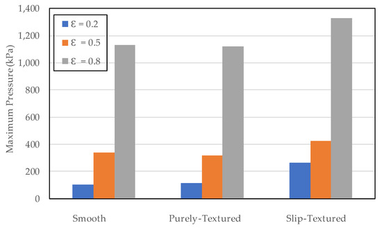 To justify the conclusion dealing with the effect of the combined slip with texturing in the case of the light loaded bearing, tribological analysis of medium and heavy loaded textured journal bearings was also performed. For this, the eccentricity ratio, ε, was changed to 0.5 and 0.8, respectively, while other input parameters for these computations were the same as ones applied for low loaded bearing analysis. Figure 16 and Figure 17 provide the results of the maximum pressure, Pmax, for the textured bearing with and without slip under medium loading (i.e., ε = 0.5) and heavy loading (i.e., ε = 0.8) conditions, respectively. Two specific features can be underlined based on these figures.