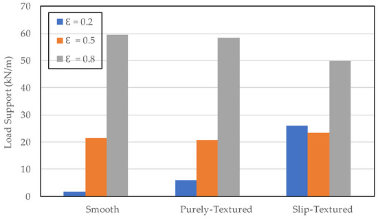 - In the case of a high eccentricity ratio, (partial) texturing leads to a reduction in load support irrespective of the texture depth and texturing arrangement in comparison to the smooth (untextured) bearing. This negative effect becomes more severe when the slip condition is applied on the textured zone.