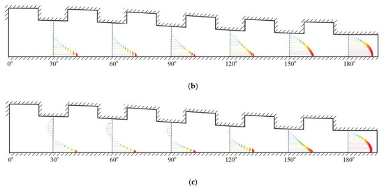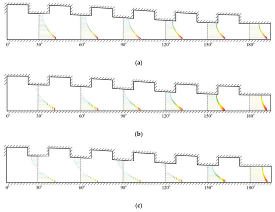 Velocity vector along the textured zone of the slip-textured zone for (a) ε = 0.2, (b) ε = 0.5, and (c) ε = 0.8. All results were evaluated at θG = 0–180° and D/hmin = 0.5.