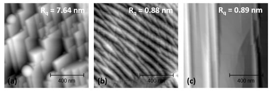 We purchased a polycrystalline cold-rolled platinum foil by Fischer Scientific Korea Ltd., Incheon, Korea, and annealed it in an Ar atmosphere at 1273 K for 30 min. As a second sample, we used a graphene-coated copper foil, which we purchased by Graphene Square, Seoul, Korea. Figure 1 shows topography images of the sample surfaces recorded by contact-mode AFM using an AFM XE-100 (Park Instruments, Seoul, Korea) with soft cantilevers. After annealing, we observe that the platinum surface facetted, resulting in smooth terraces and surface steps of several nanometers in height. Interestingly, the so formed steps in Figure 1a form right angles with each other. Surface faceting occurs to reduce the surface energy. For fcc metals, the lowest surface energy is for the (111)-orientation. We suggest that the observed right-angle span between crystallographic orientations of the type . The mean-square roughness corresponding to the Pt surface in Figure 1a is Rq = 7.64 nm. Figure 1b,c shows images of graphene-coated copper recorded over two distinct areas. In both images, we observe graphene folds, although more numerous in Figure 1b. For both imaged surface areas, the mean square roughness is similar: Rq = 0.88–0.89 nm.