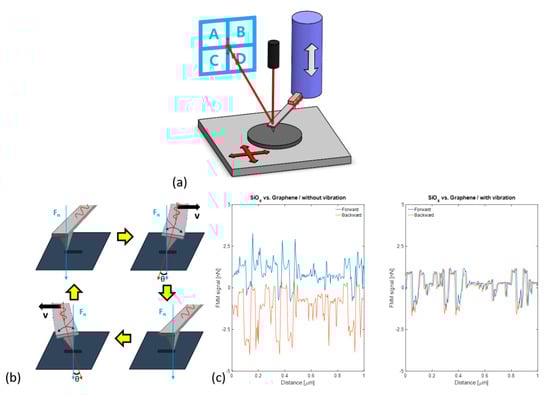 (a) Experimental set-up. (b) Friction experiment principle and (c) experimental friction loops recorded with a SiOx AFM tip on graphene with and without contact vibration.