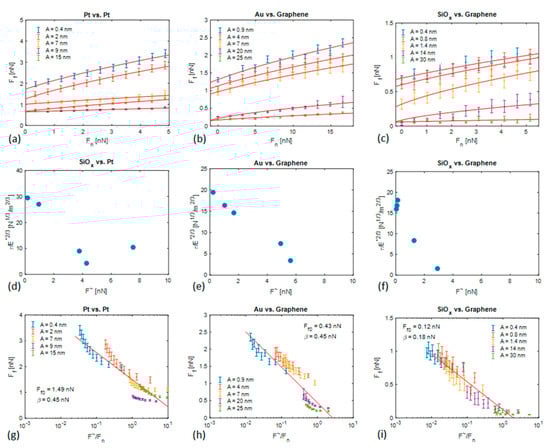 We present our experimental friction results in Figure 4. For all contact partners, i.e., Pt vs. Pt, Au vs. graphene, and SiOx vs. graphene. For all three tribological couples, we show Ff (Fn) plots recorded under the action of different modulation force values , where A is the vibration amplitude. The values for F~ ranged from 0 to 8 nN in the case of Pt vs. Pt, 0 nN to 6 nN for Au vs. graphene, and 0 nN to 3 nN for SiOx vs. graphene. We combined Equations (6) and (7) to fit each Ff (Fn) plot and extract their - and Fad-values as a function of F~. For all tribological couples, we observe a significant decrease in Ff with increasing F~ values. In most of all cases, Ff (Fn) plots acquired with a larger F~ value lay under Ff (Fn) plots recorded with lower F~-values. Also, the steepness of Ff (Fn) plots decreases with increasing F~-values. In all cases, the fit quality was good, and we determined the corresponding confidence factor R2 > 0.86. Equation (6) was initially proposed to describe the shearing friction of metals by Bowden and Tabor, in which case single asperities at surfaces may form a junction under the action of high local contact pressure, such as in cold welding. There the shear strength τ describes the mechanical resistance of such a junction to plastic deformation and ultimately to rupture. It is interesting to see how this model also applies to tribological couples that do not directly form a junction, but rather adhere to each other under the effect of water capillary forces.