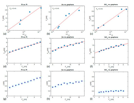 (a–c) Friction force as a function of the v/vvib- ratio for the indicated tribological couples for Fn = 3 nN; (d–f) Ff0 values as a function of Fn; (g–i) β values as a function of Fn.