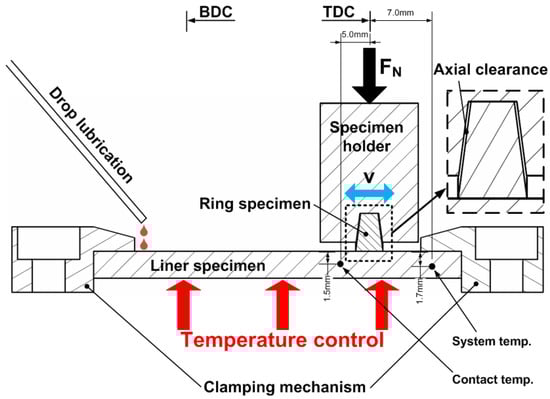 - Obert, P.; Müller, T.; Füßer, H.J.; Bartel, D. The influence of oil supply and cylinder liner temperature on friction, wear and scuffing behavior of piston ring cylinder liner contacts—A new model test. Tribol. Int. 2016, 94, 306–314. [Google Scholar] [CrossRef]