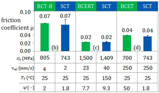 A large variation of the friction coefficient is observed. It is assumed that these variations are due to the large variation of tribological loads. By adjusting the upsetting force and relative sliding speed of the SCT, it is possible to reproduce the loads of the other tests. The respective results are compared in Figure 1.