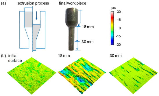 Figure 2 depicts a two stage, oil lubricated, extrusion process as well as the final specimen and depictions of the surface topography at selected locations. The initial surface exhibits a very low roughness and even topography. Within the die (18 mm), the surface shows a significant roughening, with valleys that are formed by the enclosed lubricant [10]. After passing the extrusion die, the surface still exhibits some of these lubricant pockets (30 mm).