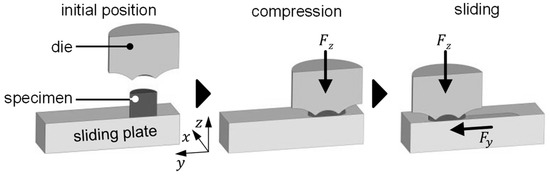 Within this current paper, the determination of the friction coefficient μ is conducted with the help of the Sliding Compression Test (SCT) [13]. A dual acting hydraulic press is utilized to apply the necessary upsetting force to the cylindrical specimens to achieve the specified contact normal stress and surface enlargement. After compression of the specimen, the compression plate is slid in relative motion against the specimen while the compression force is maintained, see Figure 4. Dividing the sliding force by the upsetting force allows the determination of the friction coefficient .
