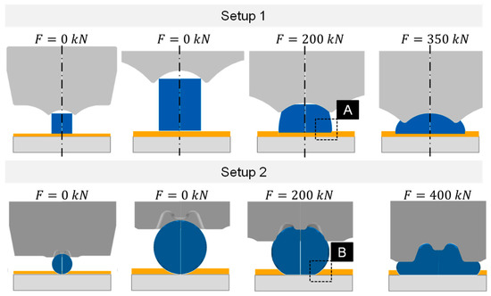 Comparison of upsetting process for the two different setups of the SCT (A and B are detailed views that are picked up on in Figure 14).