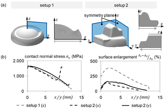 The resulting final shapes of the specimens are depicted in Figure 6 (top). The final shape of setup 1 is obtained with a compression force of , while for setup 2 a force of is used. The resulting contact normal and surface enlargement distributions at the respective force levels are depicted in Figure 6 (bottom). The contact normal stress distribution of both setups matches well for the selected force levels. However, this does not apply to the distribution of surface enlargement. Although the surface enlargement is qualitatively well matched, setup 2 exhibits approximately 2.5 times higher values due to the different material flow. While the face area is continuously enlarged during the upsetting of the specimen during setup 1, the contact surface in setup 2 is composed of both the initial contact surface and the shell surface which is not in contact at the start of the test. This leads to an overall smaller surface enlargement.